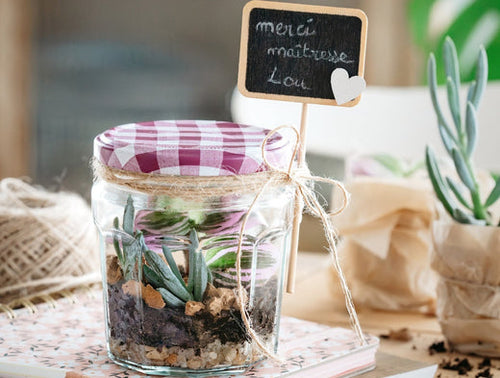 Déposez une fine couche de cailloux au fond du pot de Confiture en verre : ils permettent de drainer la terre et éviter que les racines des plantes trempent dans l’eau en permanence. Ajoutez un peu de terreau.