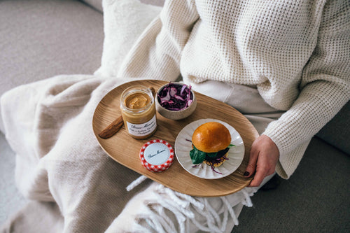 Tartinez les deux faces de sauce cacahuète, déposez le chou-rouge, le portobello et la salade de blé puis refermez.