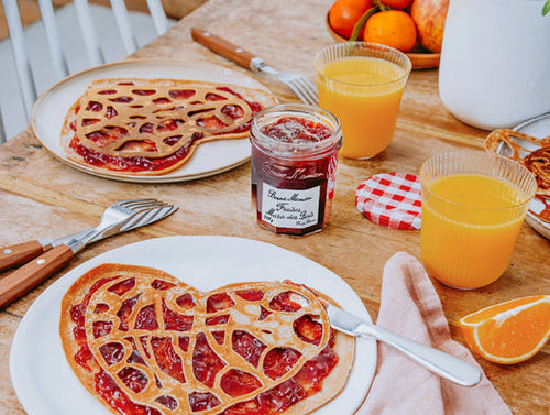 Faites chauffer la poêle en forme de cœur. Lorsqu’elle est chaude, déposez une noisette de beurre puis dessinez de la dentelle en ajustant le débit de la pâte à crêpe de votre sac congélation ou de votre flacon. Faites cuire des deux côtés quelques minutes. Faites également cuire des crêpes pleines. Déposez une crêpe pleine dans une assiette, garnissez de Confiture de fraises mara des bois Bonne Maman et recouvrez d’une crêpe en dentelle avant de déguster !