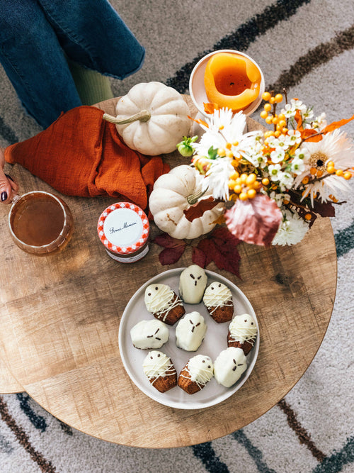 À l'aide d'une cuillère, étalez soigneusement une petite quantité de chocolat blanc sur les madeleines pour créer les fantômes, et dessinez des zigzags sur les madeleines pour créer les momies.