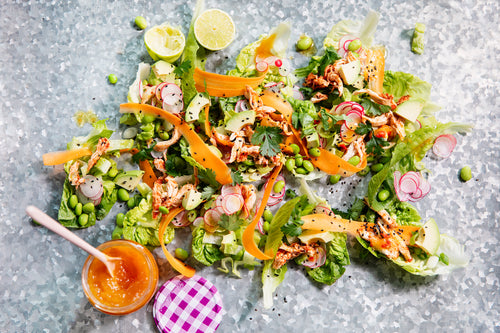 Coupez les radis en tranches. Epluchez la carotte et faites des rubans à l’aide d’un économe. Retirez la tige verte et les graines du poivron et hachez finement la chair. Coupez l’oignon nouveau en rondelles, hachez grossièrement la coriandre et coupez l’avocat en morceaux. Coupez 1 tête de laitue en lanières. Mélangez tous les légumes hachés et les graines de soja.