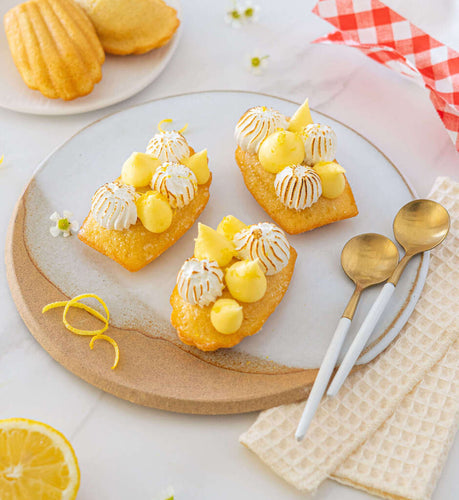 Om af te werken spuit je de meringue op je madeleines en ga je er snel met de brander overheen om ze te kleuren. Doe er dan de citroenpudding bij en versier met wat citroenschil.