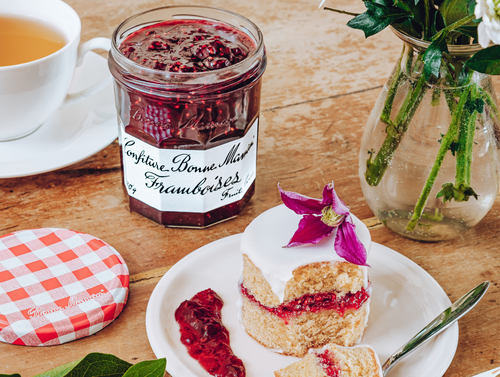 Snijd schijfjes uit de cake met een uitsteekvormpje. Smeer de frambozenconfituur van Bonne Maman op een schijfje en bedek het met een ander schijfje.