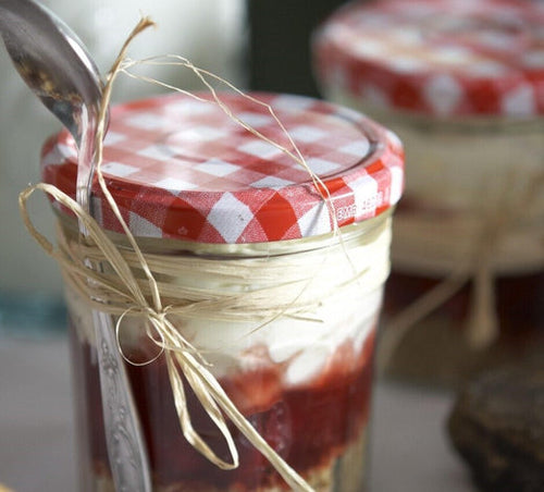 Taart in een potje met aardbeienconfituur van Bonne Maman