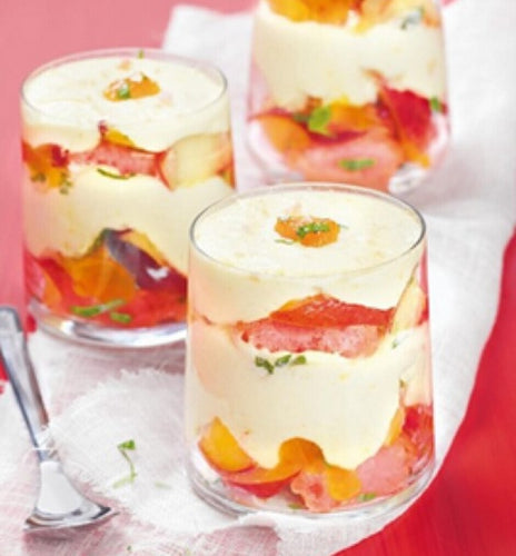 Schep een deel van het mascarponemengsel in de glaasjes. Leg hierop een half koekje en verdeel er de rest van de perzikensla over. Werk af met de rest van het mascarponemengsel.